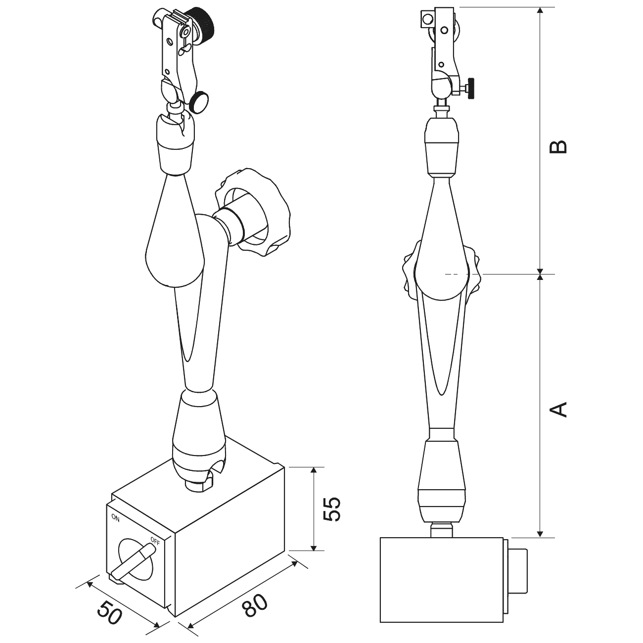 • Adjustable arms with central locking and fine adjustment. Flat and V-groove fine grinded magnetic base, Ø 8 mm clamping shaft.